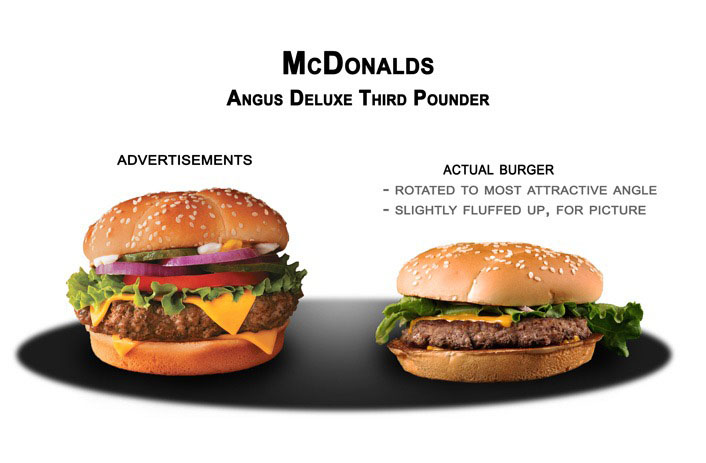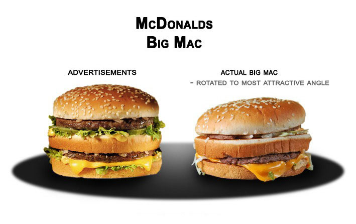 Vous avez faim, très faim, et vous avez commander ce magnifique Bic Mac qui vous hypnotise par sa grandeur, la couleur vive et sanglante de la viande, la disposition quasi-parfaite des légumes et enfin le fromage si merveilleusement gratiné. Sauf que…vous ouvrez votre boîte et là, c’est le drame!!!! Vous vous retrouvez avec espèce d’hamburger rikiki, qui dégouline de fromage, qui est penché, qui laisse tomber tous son contenu à chaque tentative de prise en main, bref MOCHE, PETIT et IMPOSSIBLE A MANIER! L’arnaque quoi… La preuve en images avec ces quelques photos comparatives des burger des publicités VS. réalité!