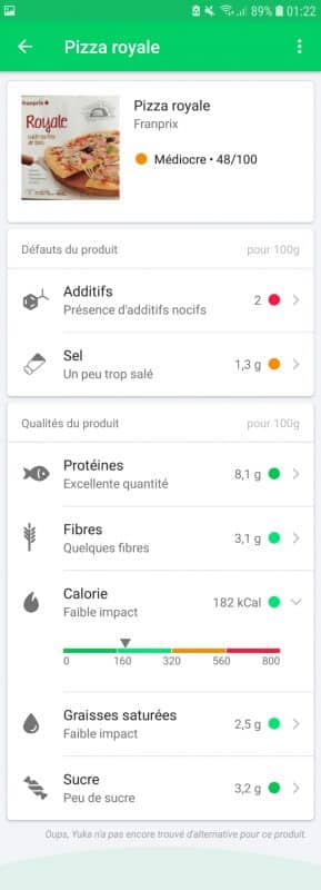 Prenons l’exemple d’une pizza : avec ses 182 calories par 100 grammes, Yuka classe la pizza dans la catégorie « à faible impact calorique » (ce qui est le cas de toutes les pizzas !). Mais rare sont ceux qui se limitent à 1 morceau de pizza ? En réalité, on compte plutôt 364 calories (pour la moitié d’une pizza) voire 728 calories (pour la pizza entière) – ce qui est finalement loin d’être négligeable…