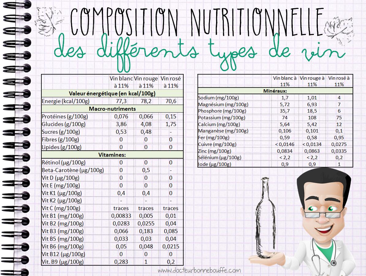 Composition nutritionnelle du vin blanc, rouge et rosé