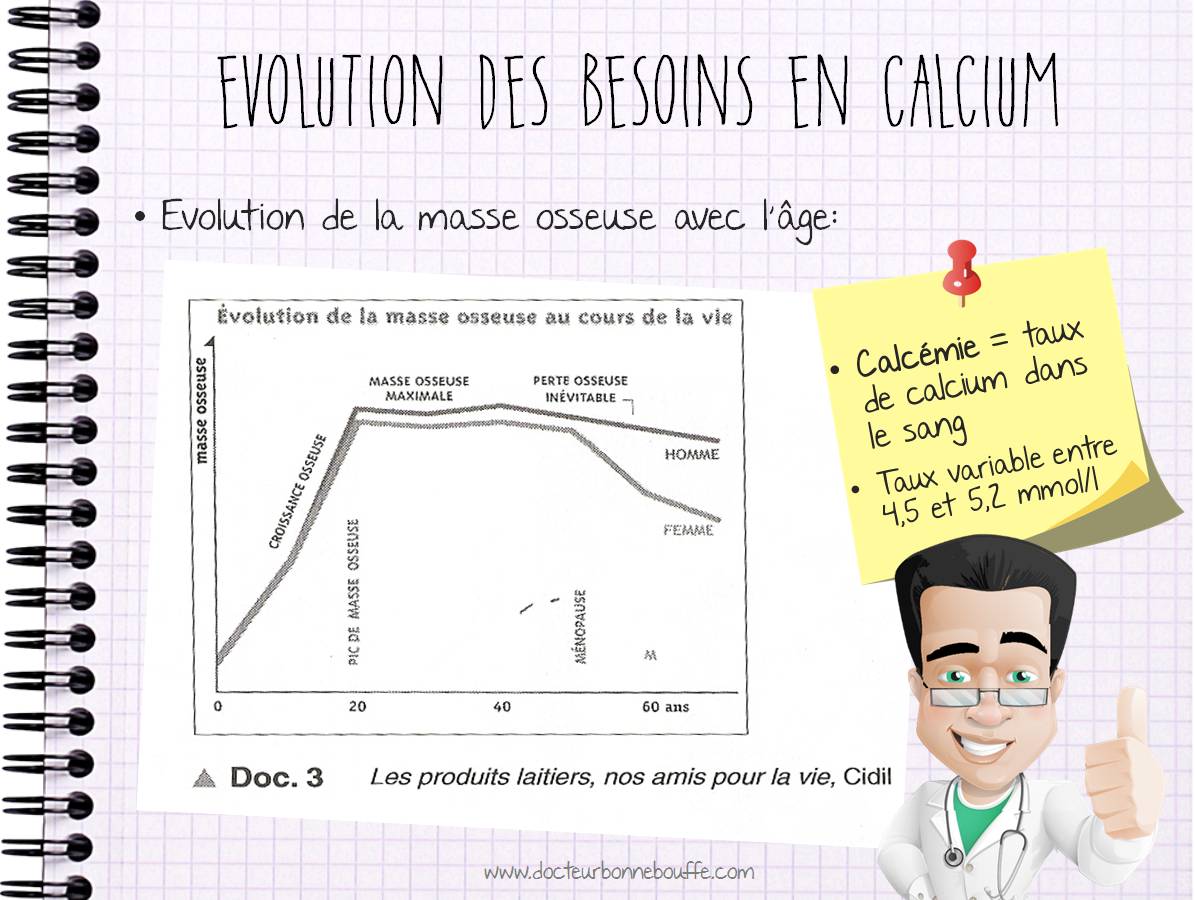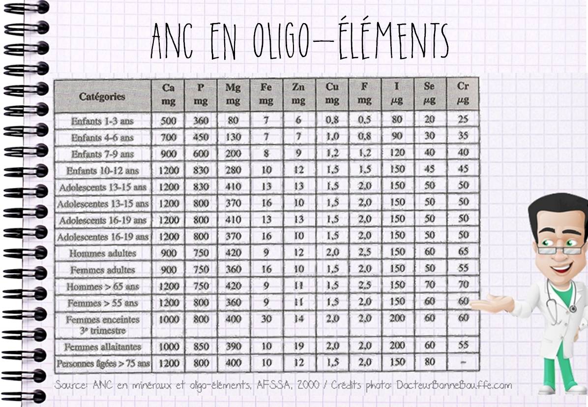 Ainsi, on constate que les besoins en calcium augmentent au fil des années. Les Apports Nutritionnels Conseillés (ANC) sont de 500 mg chez le nourrisson, de 700 mg chez l’enfant de 4 à 6 ans, de 900 mg chez l’enfant de 7 à 9 ans et de 1200 mg jusqu’à 19 ans.