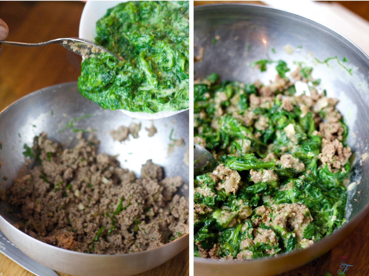 2) Cuisez les épinards dans une eau bouillante pendant 2 minutes. Pressez les épinards pour enlever l’excédent d’eau puis ajoutez une partie de la crème, le sel et le poivre. Mélangez bien et ajoutez la viande hachée.