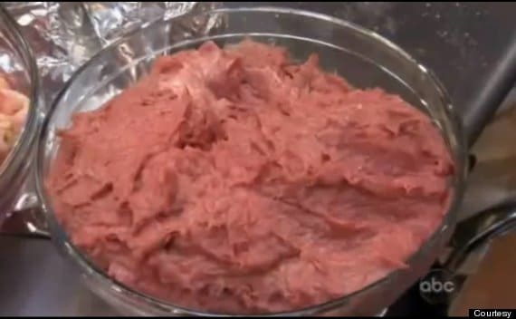 La fausse viande ne concernerait pas uniquement les nuggets: Aux Etats-Unis, la chaîne de fast food mexicaine, Taco Bell, a fait polémique dernièrement après la publication d’images de viande de bœuf destinée aux tacos « Doritos Locos », une fois leur arrivée en cuisine. En effet, ce qui semblerait être du pain d’épice (photo ci-dessous), n’est en fait que de la… viande en sac! Une viande qui, outre son aspect répugnant, ne serait constituée que de… 36% de bœuf.