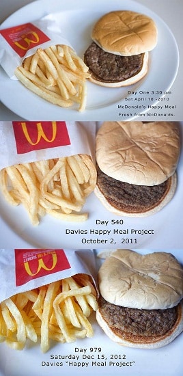 En avril 2010, une certaine Sally Davies, photographe professionnelle américaine, décide de se lancer dans une expérience incroyable: elle achète dans le célèbre fast food McDonald’s un menu Happy Meal en vue de le photographier dans le temps.