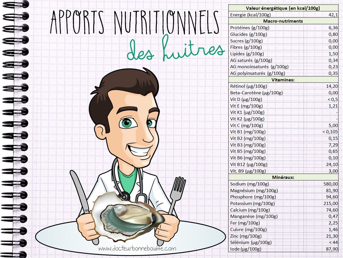 Et si l’huître contient des lipides, comme les poissons gras, elle est riche en oméga-3, acides gras essentiels pour le bon fonctionnement du système immunitaire. Elle peut néanmoins être un aliment « régime » intéressant à condition de ne pas ajouter de matières grasses additionnelles lorsque vous la consommer (exemple : du beurre sur le pain).