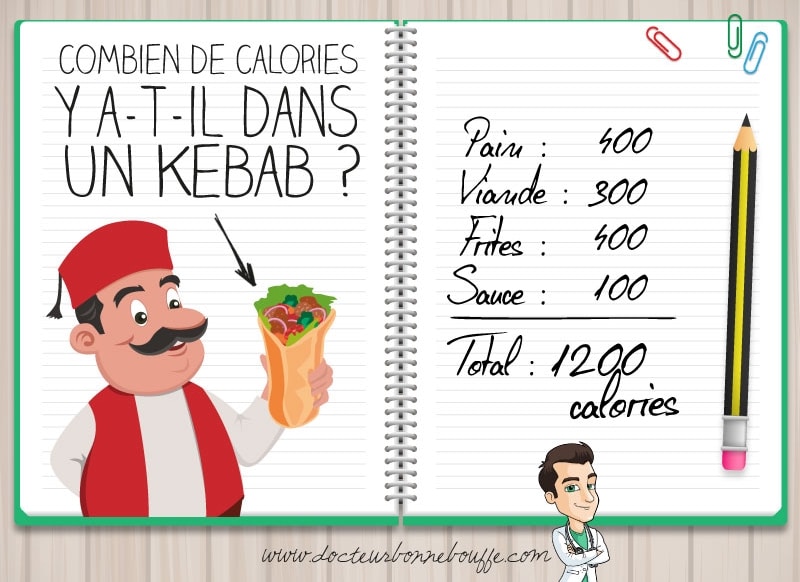 Le LACORS (une agence anglaise chargée du contrôle sanitaire) a réalisé en 2008 une enquête auprès de 500 restaurants Kebabs. Selon les résultats, un kebab contiendrait en moyenne 1200 calories (boisson non comprise…) (2)! Une gourmandise très calorique donc, et pour cause :