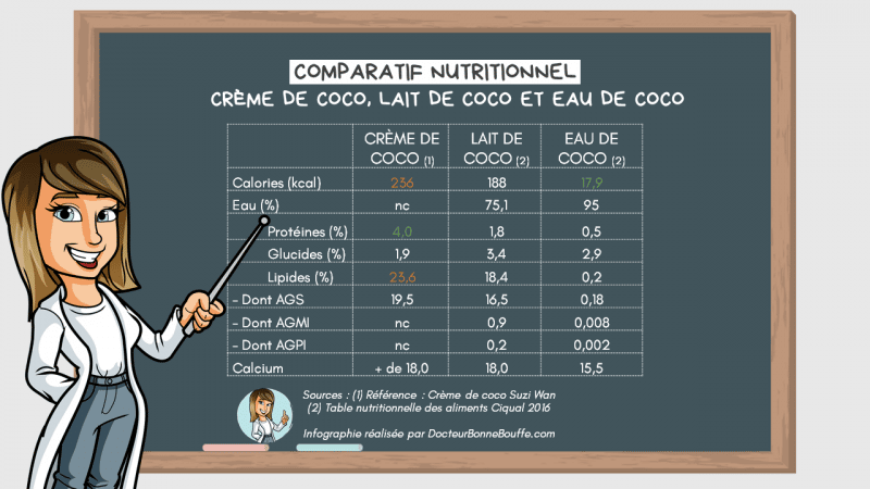 Enfin, si vous faites attention à votre poids, regardez bien les étiquettes nutritionnelles : l’ajout d’eau dans le lait de coco peut-être très variable d’un fabriquant à un autre. On peut donc trouver des laits de coco plus ou moins caloriques/riches en graisses. Autre astuce : vous pouvez aussi choisir de faire votre lait de coco maison pour diminuer son apport en graisses !