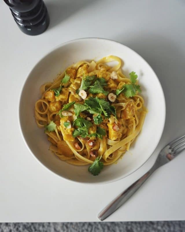 Recette : Linguine à la crème de potiron, parsemés de coriandre fraîche et de noisettes concassées