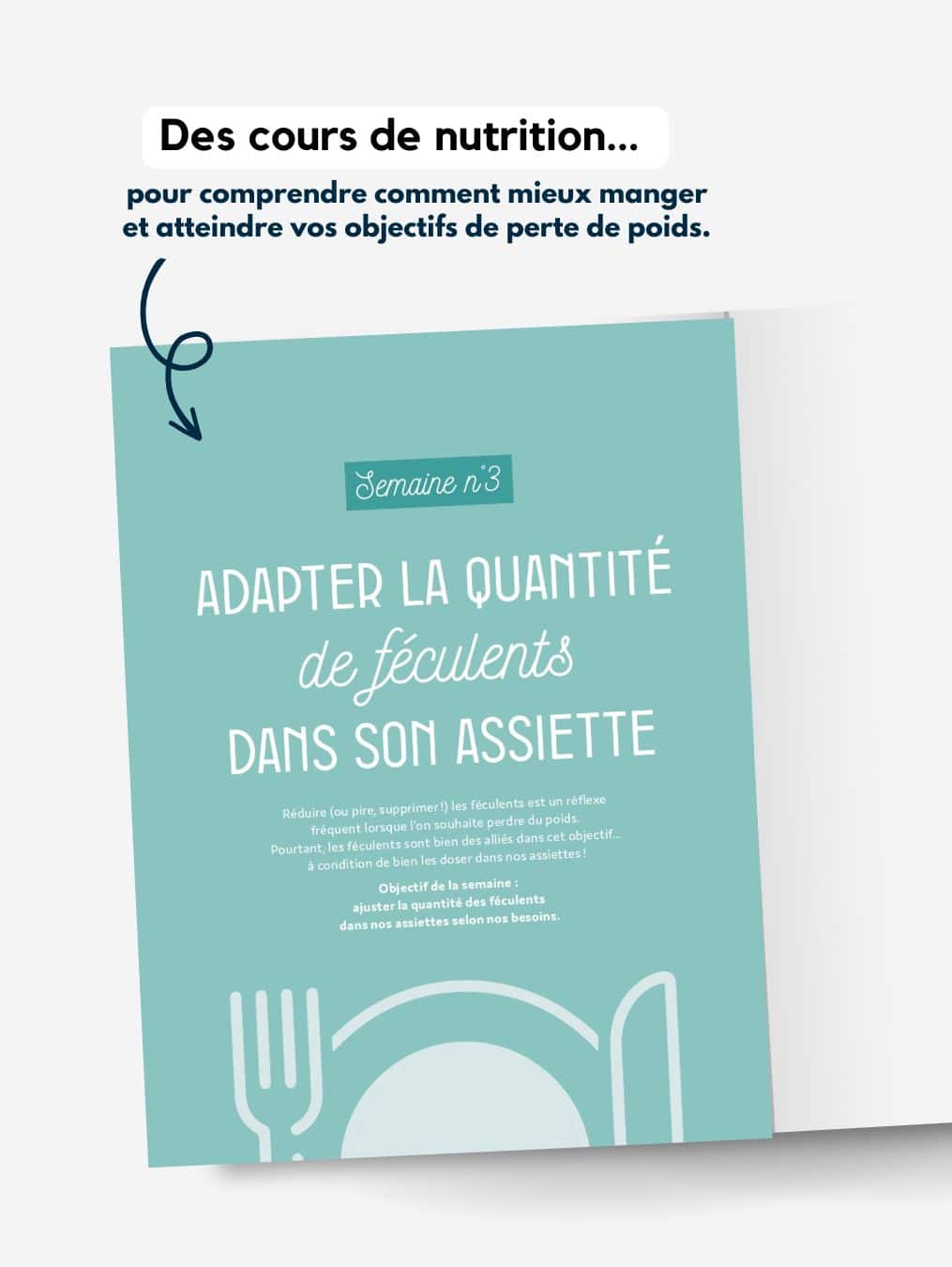 Chaque début de semaine, vous trouverez dans le livre des cours de nutrition centrés sur des thématiques clés pour votre perte de poids (12 thématiques au total, soit une par semaine) : décrypter vos envies de grignotage, ajuster vos portions, comprendre vos sensations de faim et de satiété…
