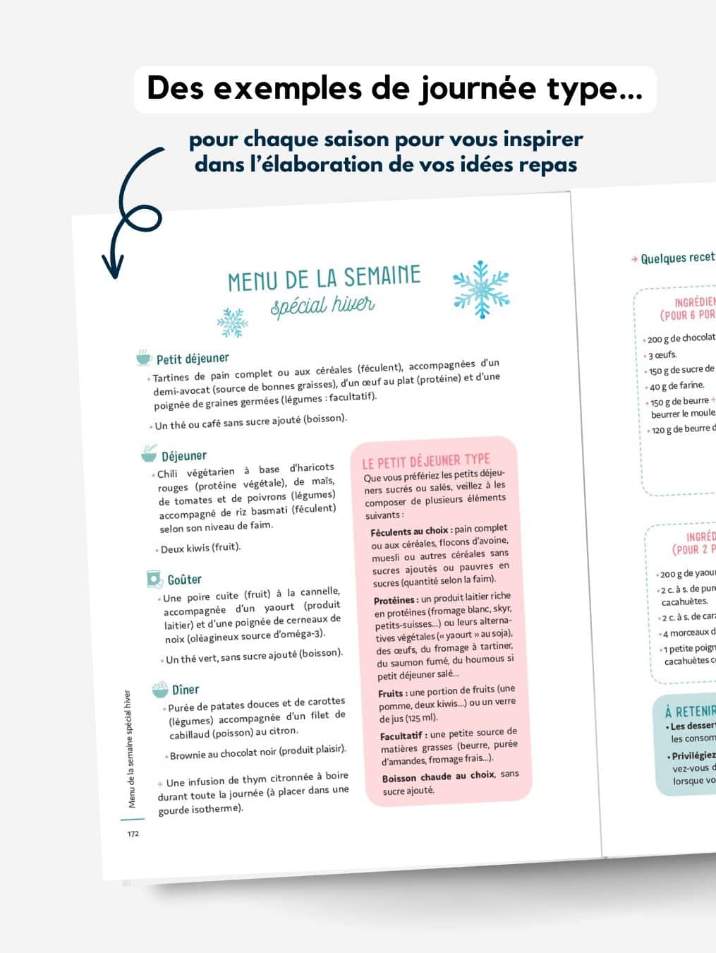 En bonus du livre, vous trouverez également 4 exemples de journée type, adaptés à chaque saison (automne, hiver, printemps, été). Cela permet aussi de vous donner une vision concrète de ce que pourrait être une journée équilibrée. A vous d’adapter selon vos préférences alimentaires ou vos envies.