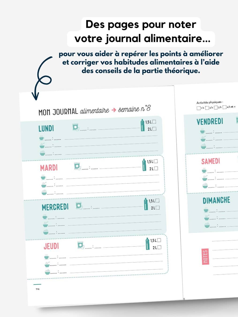 Chaque semaine, une double page est dédiée au suivi de votre journal alimentaire. Je vous y invite à noter vos repas, boissons, grignotages ou encore vos sensations de faim, afin de mieux prendre conscience de vos habitudes alimentaires. Cet exercice est précieux, car il vous permet d’observer vos comportements, d’identifier vos automatismes et de comprendre ce qui peut freiner vos objectifs. C’est un outil utile pour repérer les points à améliorer et éventuellement corriger vos habitudes alimentaires en vous aidant des conseils de la partie théorique.