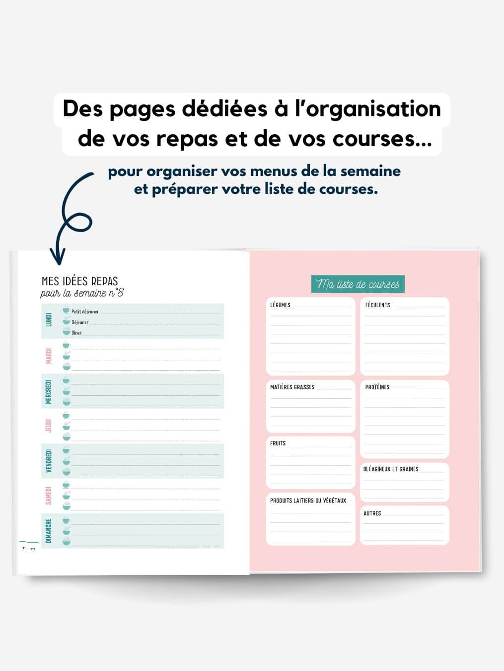 Des pages dédiées à l’organisation vous guident chaque semaine à établir vos idées repas et préparer vos listes de courses. Comme je le dis à mes patients, une bonne organisation est la clé pour mieux manger et à long terme !