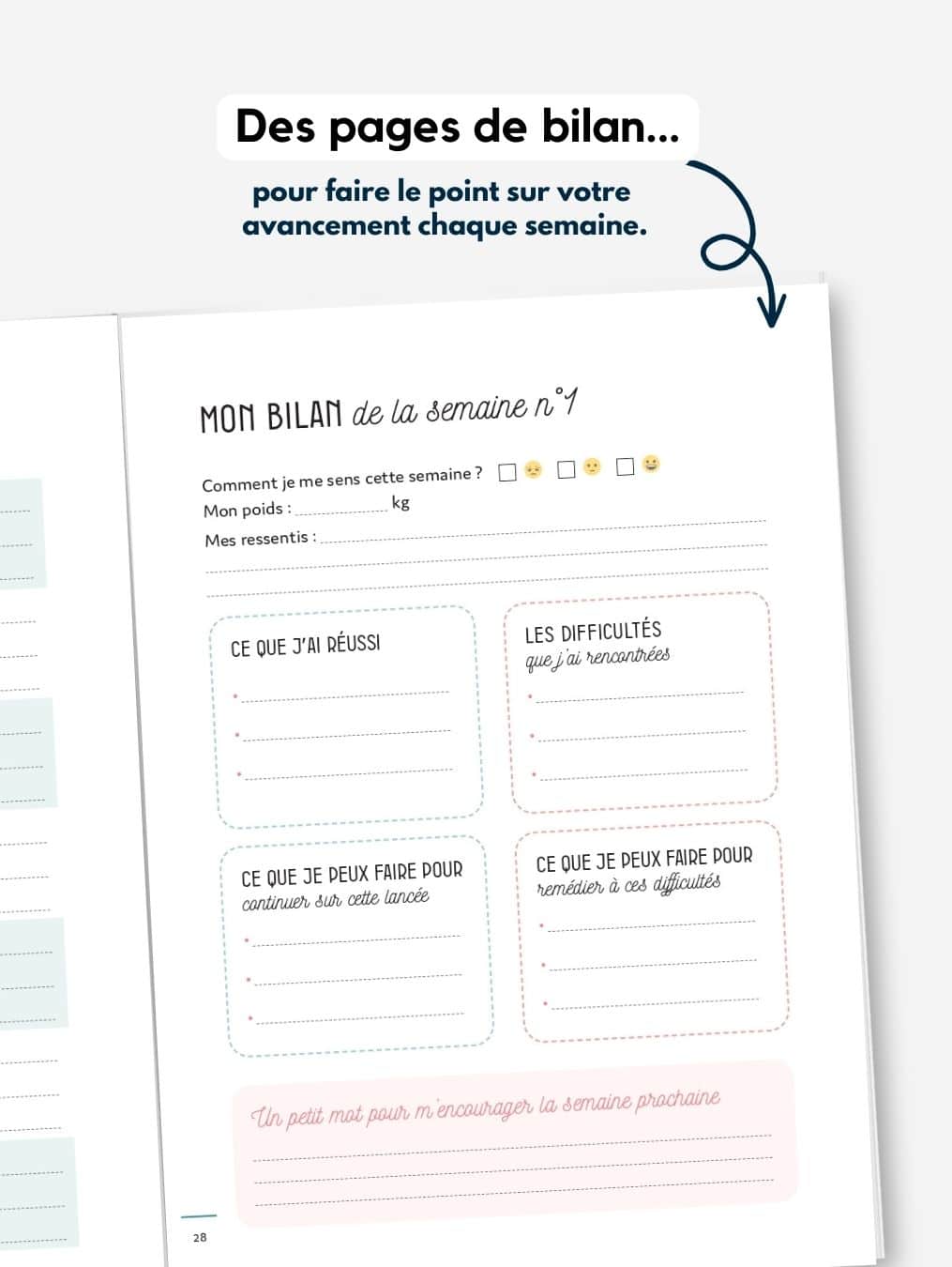 Comme dans tout livre dédié à la perte de poids, des encarts hebdomadaires ainsi qu’une page dédiée vous permettront de noter l’évolution de votre poids par rapport à votre objectif. Mais attention à bien garder en tête qu’une perte de poids durable demande du temps ! J’ai tenu à ce que, lors des bilans hebdomadaires, votre avancement soit davantage valorisé par les habitudes alimentaires que vous avez réussi à mettre en place, plutôt que le résultat sur la balance.