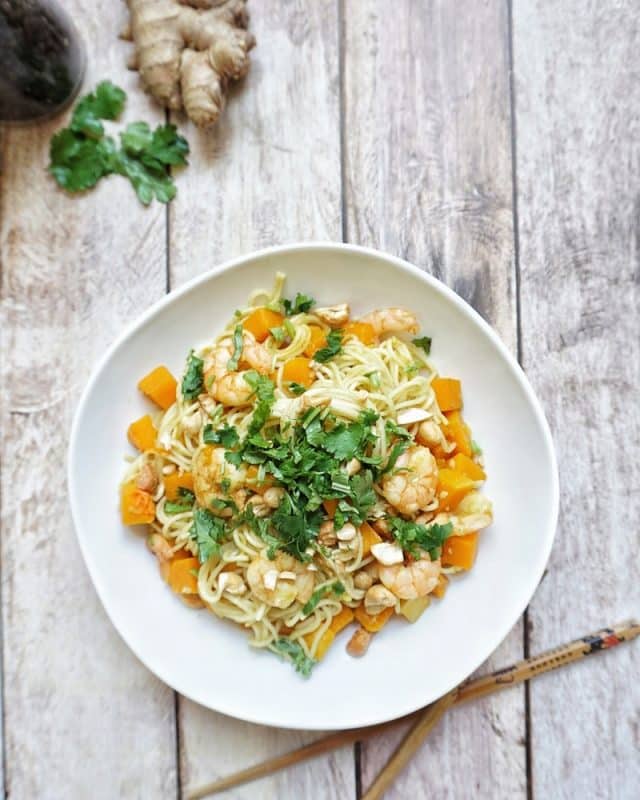 Mes astuces pour des nouilles sautées à la courge butternut et aux crevettes… saines et gourmandes !