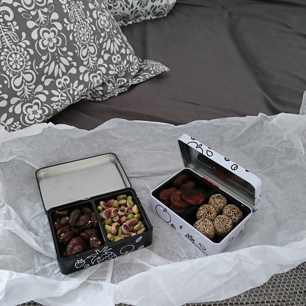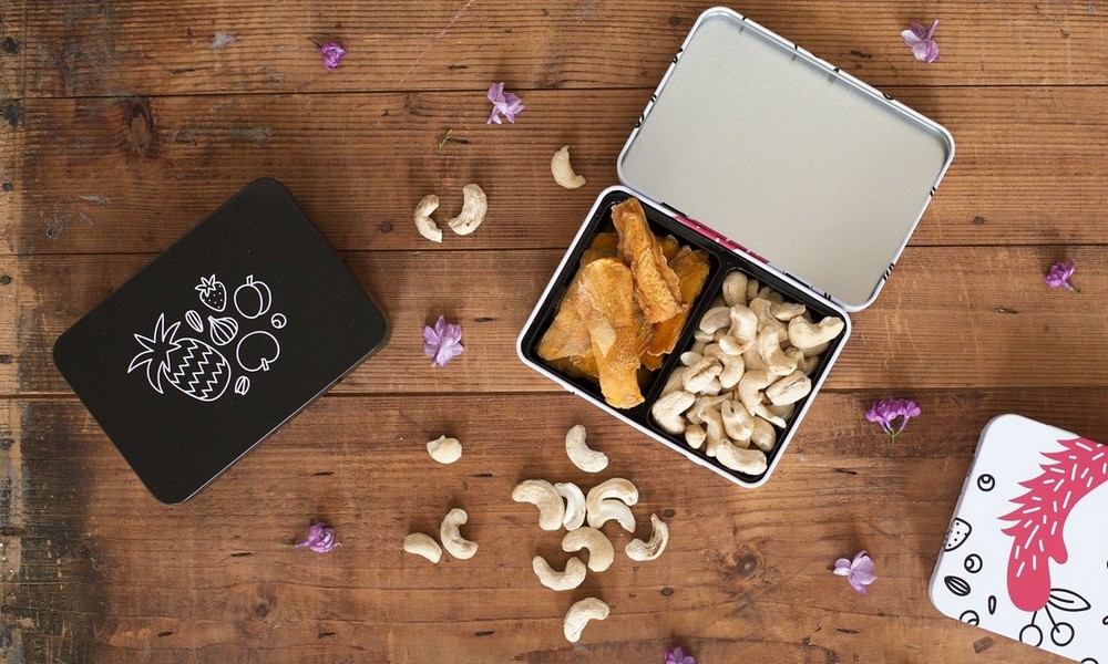Il faut avouer : les en-cas sont délicieux, mais ce qui nous fait craquer, c’est surtout la petite box métallique, qui renferme deux compartiments, dans lesquels on peut mettre les en-cas choisis en vue de les transporter partout avec nous !