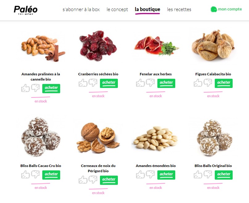 Le site internet propose « la plus grande diversité d’en-cas non transformés » : des baies, des fruits séchés, des oléagineux, du chocolat cru, des energy balls ou encore du jambon fumé… bref que des bonnes choses !