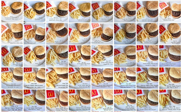 Comme Karen Hanrahan, une artiste new-yorkaise Sally Davies a réalisé une expérience similaire: elle photographie depuis trois ans l’évolution d’un menu Happy Meal. A raison de une photo par jour, on peut observer que ni les frites, ni l’hamburger ne se dégrade. (Plus d’informations sur son expérience, baptisée le « Happy Meal Project » ici).