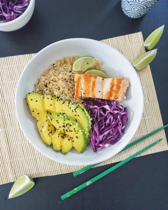 - Une fois le riz cuit, disposer dans un un bol : le riz, l’avocat, le chou et le saumon grillé.