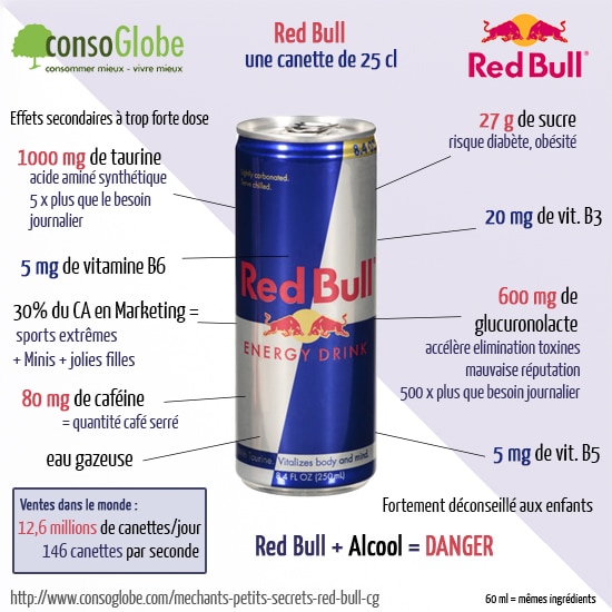 Branchées, provocantes, "sportives", les boissons dites "énergisantes" sont à la mode et touchent de plus en plus de jeunes sensibles aux sirènes de l'industrie agro-alimentaire. Mais ces boissons "excitantes" peuvent, lorsqu'elles sont associées à certains modes de consommation (alcool, sport,…), générer des effets indésirables et même des accidents cardiaques graves chez certains consommateurs porteurs de prédispositions génétiques fréquentes et généralement non diagnostiquées. Source : notre-planete.info, http://www.notre-planete.info/actualites/3813-Red-Bull-danger-sante