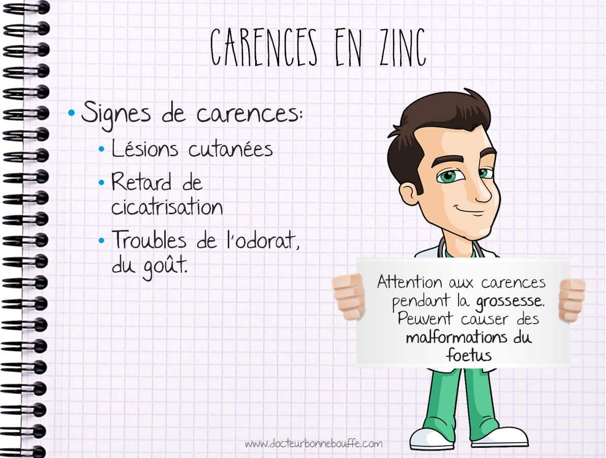 L’organisme a besoin de peu de quantités de zinc (à peine 10 à 12 mg par jour pour un adulte), mais cet apport est vital. Lorsqu’une carence en zinc s’installe, on constate de suite une diminution des fonctions immunitaires ainsi que les symptômes suivants :
