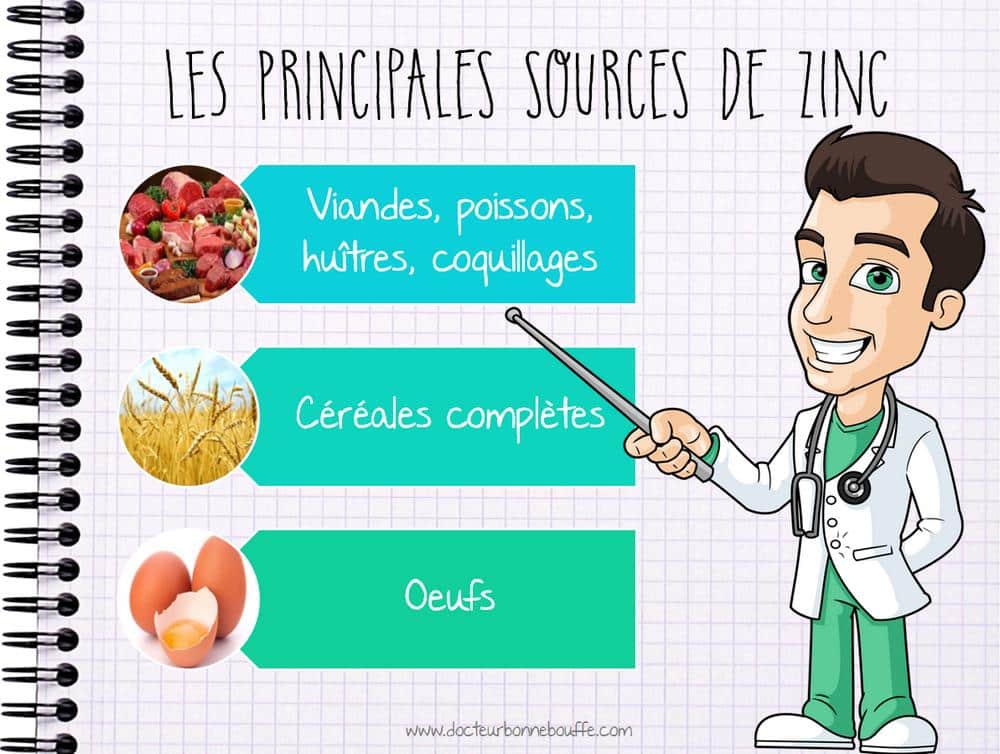 Les principales sources alimentaires en zinc sont les viandes, les fruits de la mer, les céréales complètes et les oeufs.