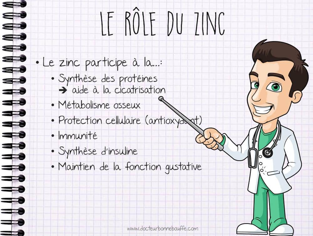 Le zinc est un oligo-élément (=un nutriment présent en petites quantités dans notre organisme) qui entre dans la fabrication d’une centaine de processus enzymatiques vitaux dans l’organisme :